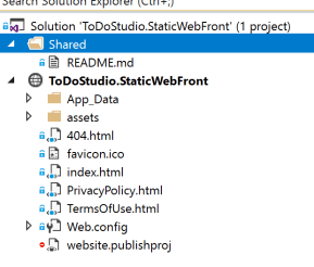 As you can see, it’s just a bunch of HTML, CSS and stuff, with a small web.config so that we can host on IIS (we are using Azure App Services for this). The first thing which is abnormal though and unlike a normal ASP.NET project, I do not have a CSPROJ that describes my project, instead, I have a PUBLISHPROJ, and it gets ignored by GIT. So how did we get here ?